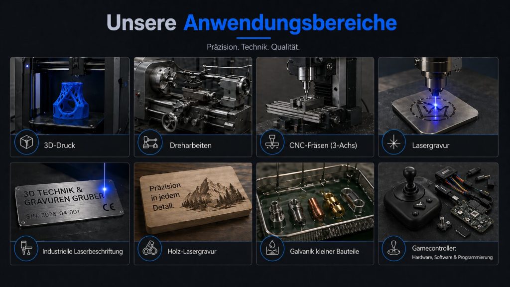 Ich biete 3D-Druck, kleinere konventionelle Dreharbeiten auf der Drehbank, 3-Achs-CNC-Fräsarbeiten, Lasergravur, industrielle Laserbeschriftung, Holz-Lasergravur, Galvanisierung kleiner Bauteile sowie individuelle Gamecontroller-Lösungen an. Dabei geht es vor allem um Einzelteile, Prototypen, Ersatzteile, Sonderanfertigungen, Beschriftungen, Kleinserien und technische Speziallösungen.